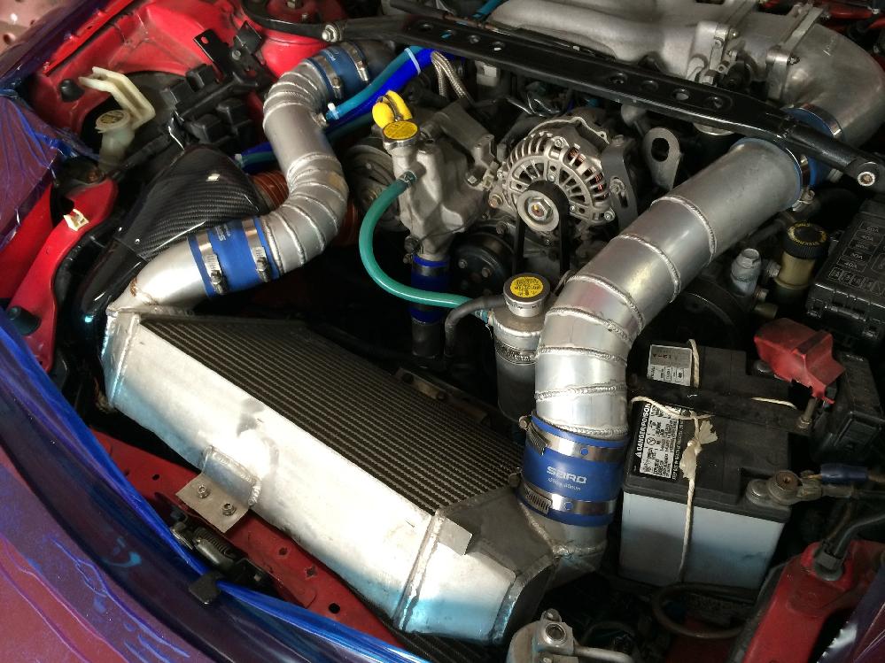 FD3Sにトラストインタークラーを加工して使ってVマウント製作です。タービンはHKSのTO4Sです。インタークーラのサイドタンクを加工して製作しました。